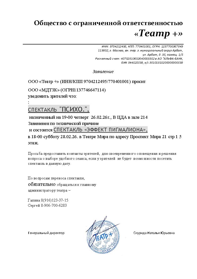 Уважаемый клиент! Спешим сообщить, что по информации, полученной от организатора, спектакль «#ПСИХО», запланированный на 26 февраля 2026 года в 19:00 в Центральном Доме Актёра, заменён на спектакль «Эффект Пигмалиона». Также спектакль состоится 28 февраля 2026 года в 18:00 и пройдёт в Театре Мира (ст. м. Проспект Мира, г. Москва, Проспект Мира, дом 21 с.1, 5 этаж). По вопросам переноса спектакля обращайтесь, пожалуйста, к главному администратору театра по номеру телефона: 8 (916) 123-37-15 (Галина) и 8 (906) 700-62-83 (Сергей). С уважением, команда поддержки Ticketland.