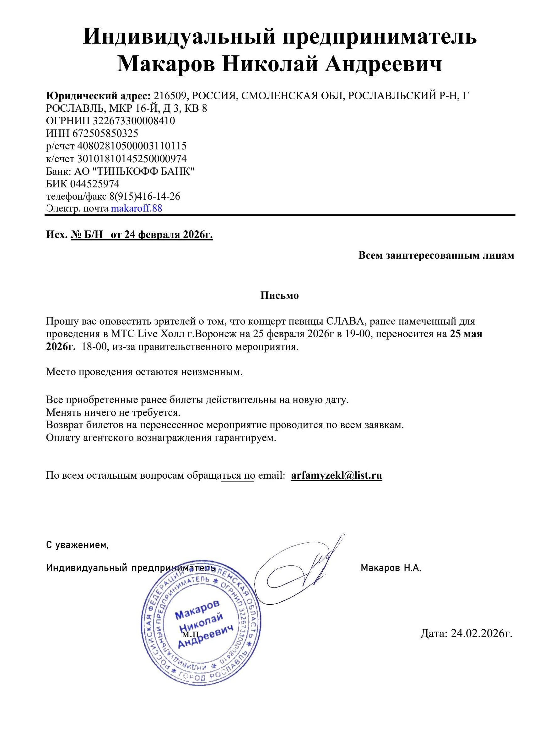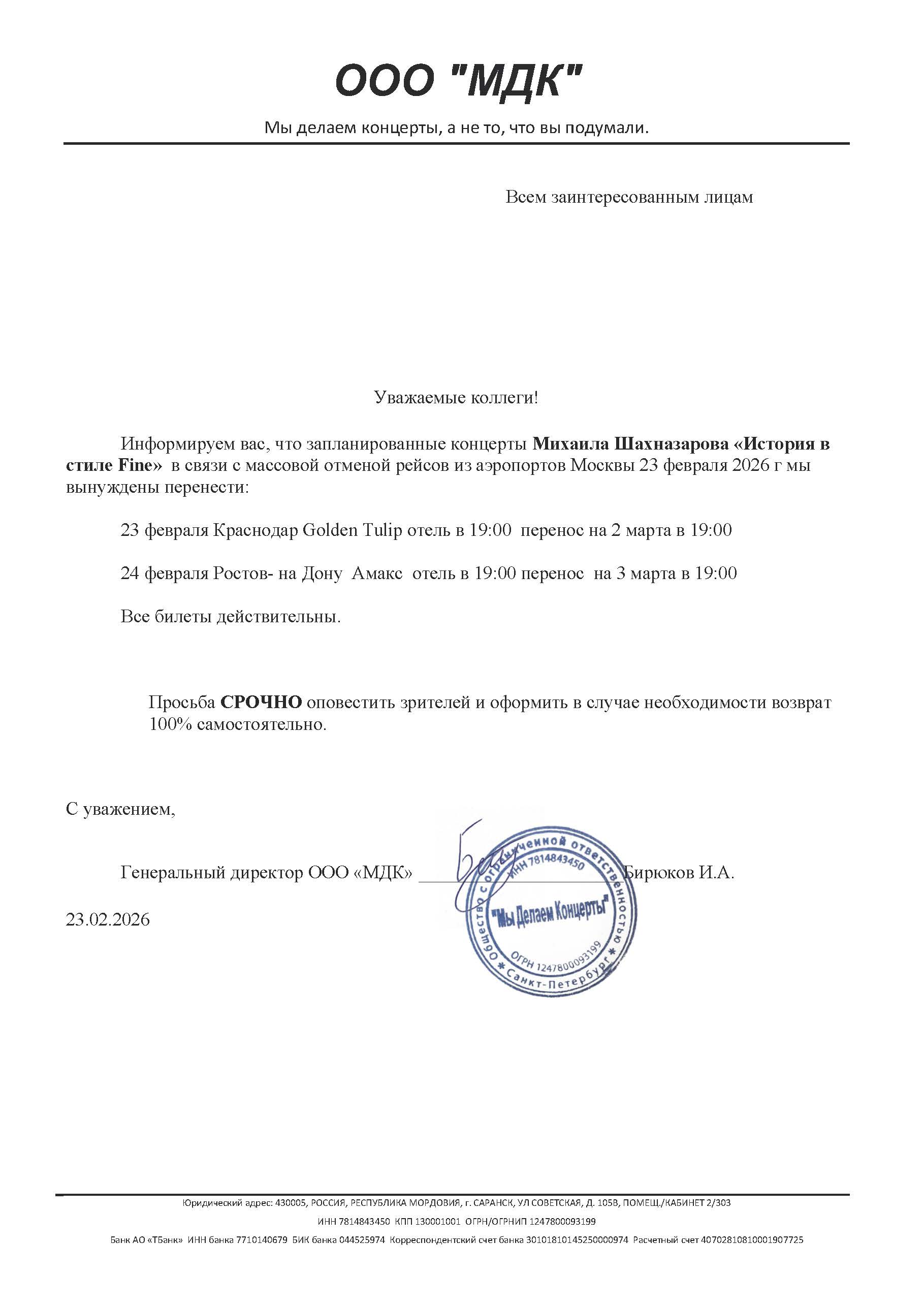 Уважаемый клиент! Спешим сообщить, что по информации, полученной от организатора, концерт Михаила Шахназарова «История в стиле Fine», запланированный на 24 февраля 2026 года в 19:00 в конгресс-отеле Амакс, перенесён на 3 марта 2026 года, начало в 19:00. Ранее приобретенные билеты действительны на новую дату, обменивать их не нужно. Если вам не удобно посетить концерт в новую дату, вы можете вернуть билет по кнопке в личном кабинете во вкладке «Заказы». Деньги за электронные билеты вернутся автоматически в полном объёме на карту, с которой была произведена оплата. Если вы купили билет в кассе Ticketland.ru за наличный расчет, то обратитесь, пожалуйста, на почту: vozvrat@ticketland.ru. С уважением, команда поддержки Ticketland.