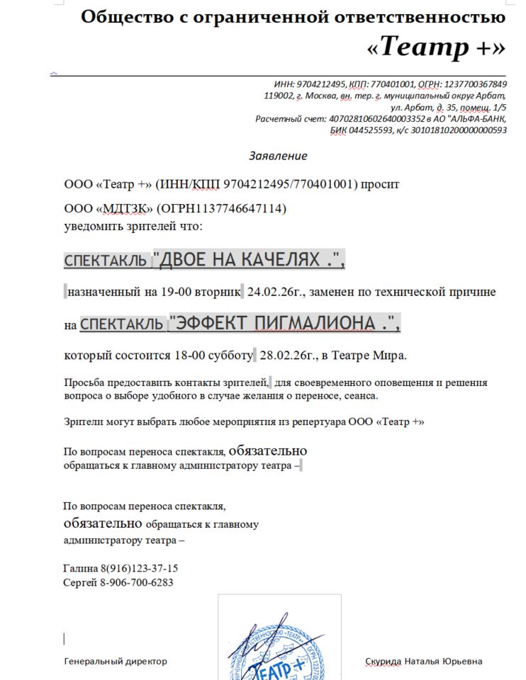 Уважаемый клиент! Спешим сообщить, что по информации, полученной от организатора, спектакль «Двое на качелях», запланированный на 24 февраля 2026 года в 19:00 в театре Мира, заменен на спектакль «Эффект Пигмалиона» и перенесен на 28 февраля 2026 года, начало в 18:00. По вопросам возврата и переноса на другую дату зрителям необходимо обращаться к главному администратору театра: Галина 8-916-123-37-15, Сергей 8-906-700-62-83. С уважением, команда поддержки Ticketland.