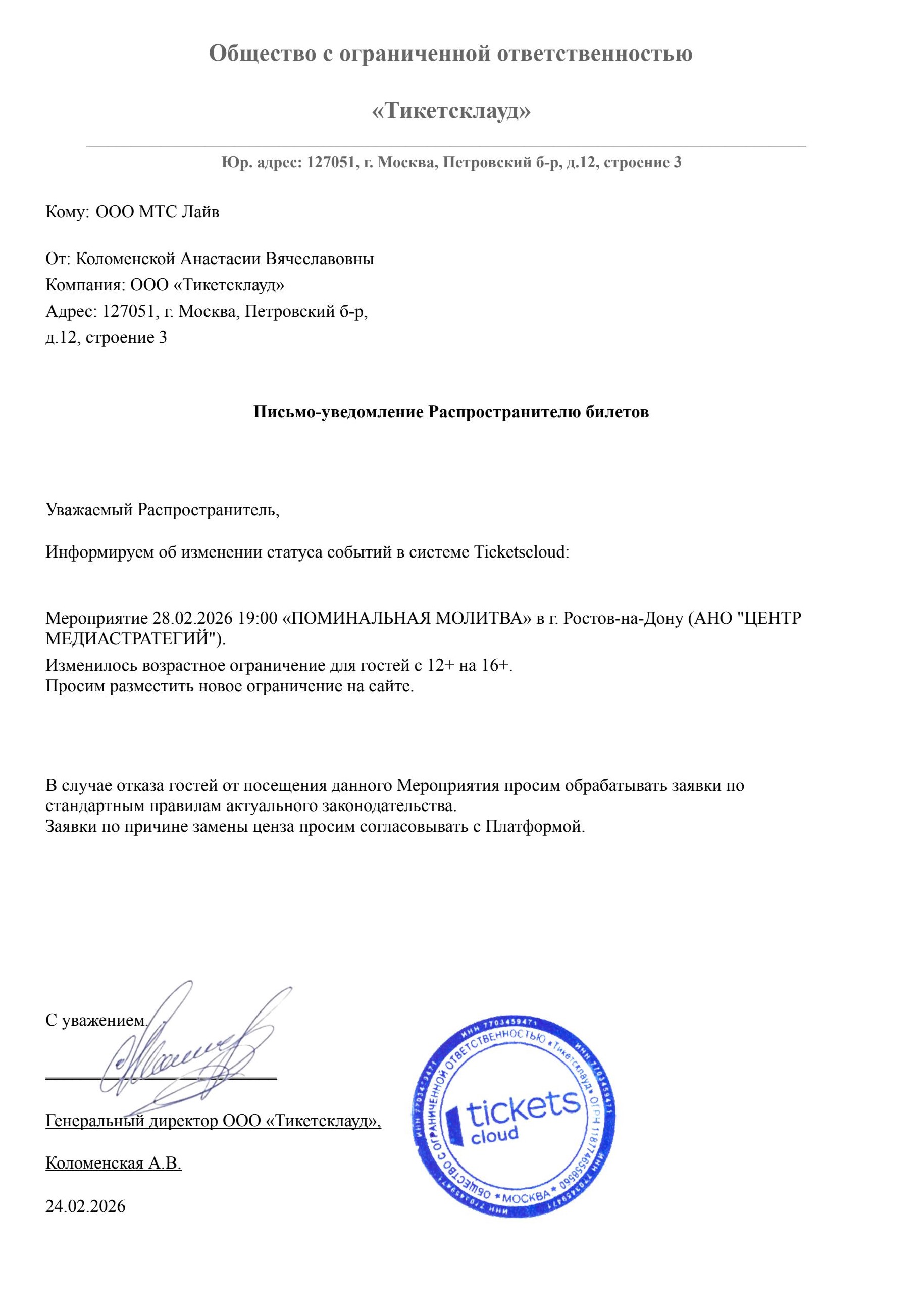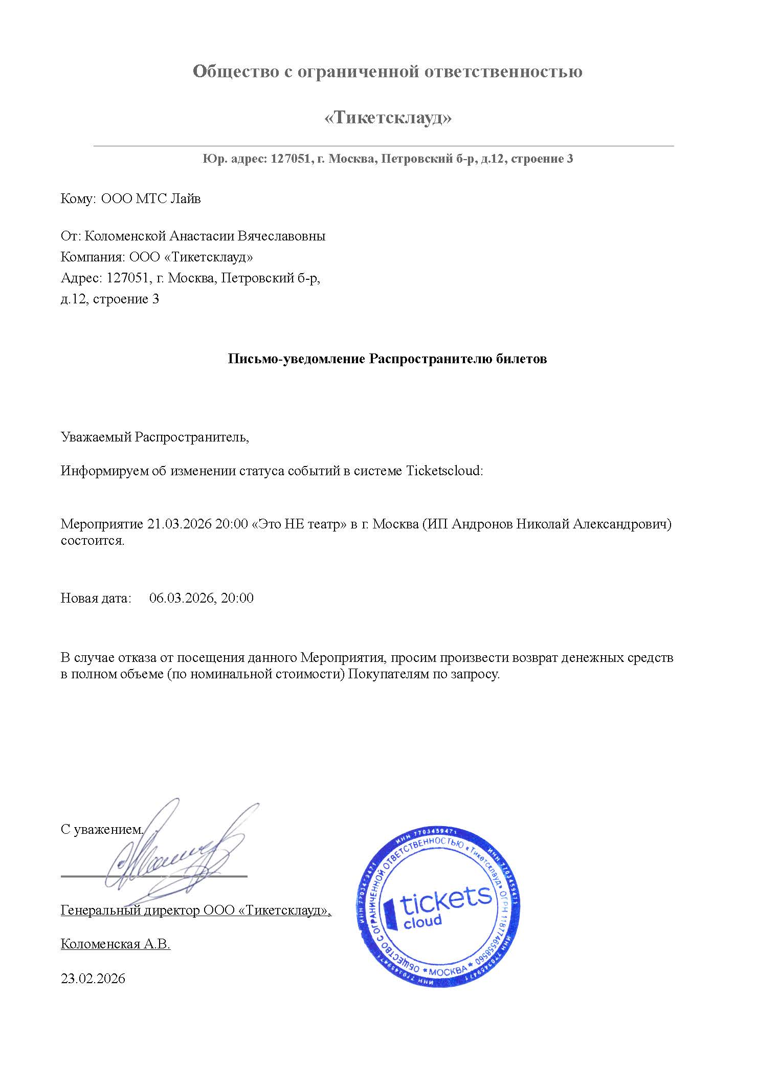 Уважаемый клиент! Спешим сообщить, что по информации, полученной от организатора, спектакль «Пятая печать», запланированный на 23 февраля 2026 года в 19:00 в МТЮЗе, заменен на спектакль «День рождения Смирновой». Ранее приобретенные билеты действительны, обменивать их не нужно. Если вы не хотите посетить мероприятие, вы можете вернуть билет по кнопке в личном кабинете во вкладке «Заказы» (до 23.02.2026 19:00). Деньги за электронные билеты вернутся автоматически в полном объёме на карту, с которой была произведена оплата. Если вы купили билет в кассе Ticketland.ru за наличный расчет, то обратитесь, пожалуйста, на почту: vozvrat@ticketland.ru. С уважением, команда поддержки Ticketland.