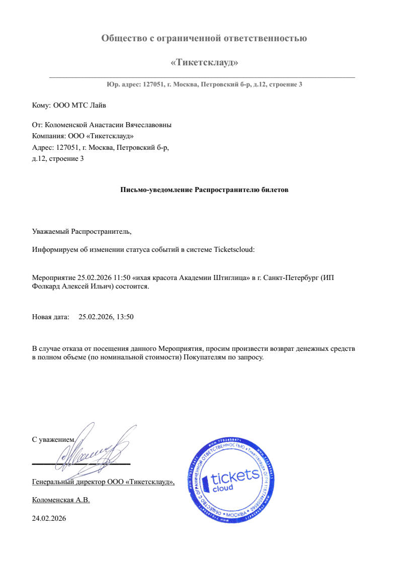 Уважаемый клиент! Спешим сообщить, что по информации, полученной от организатора, экскурсия «Тихая красота Академии Штиглица», запланированная на 25 февраля 2026 года в 11:50 в Академии Штиглица, перенесена на 13:50. Ранее приобретенные билеты действительны, обменивать их не нужно. Если вы не хотите посетить мероприятие, вы можете вернуть билет по кнопке в личном кабинете во вкладке «Заказы». Деньги за электронные билеты вернутся автоматически в полном объёме на карту, с которой была произведена оплата. Если вы купили билет в кассе Ticketland.ru за наличный расчет, то обратитесь, пожалуйста, на почту: vozvrat@ticketland.ru. С уважением, команда поддержки Ticketland.