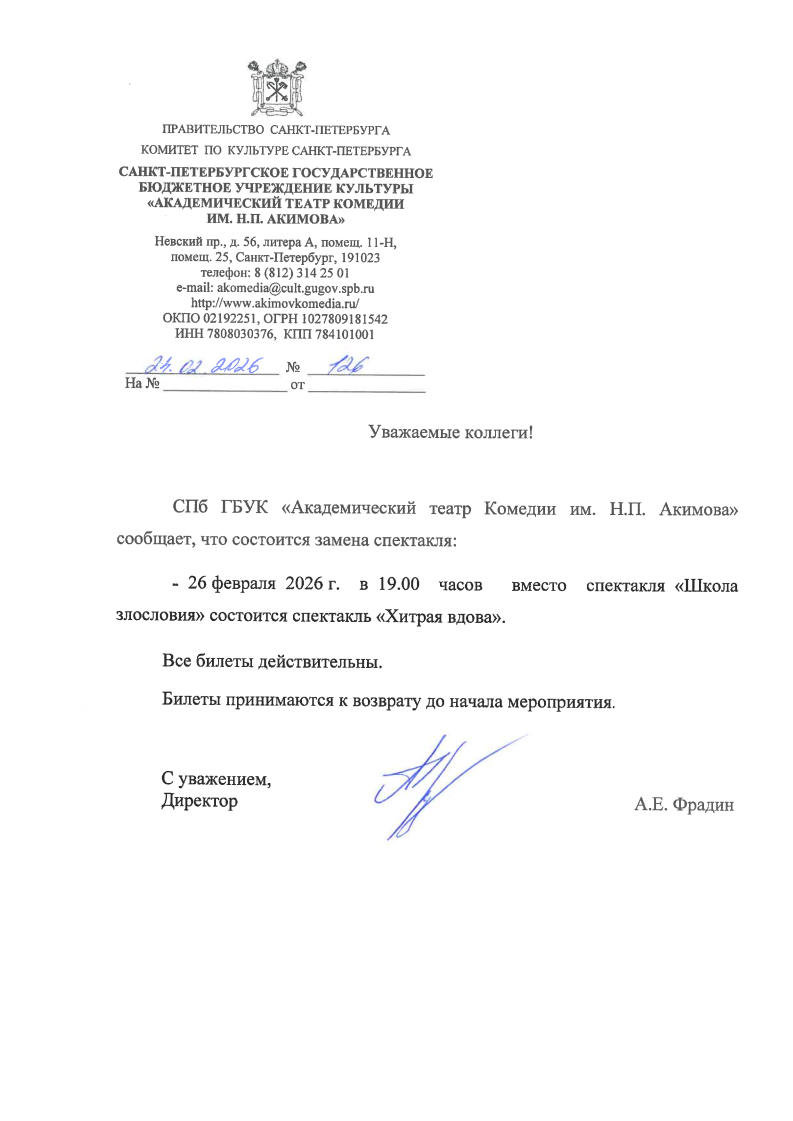 Уважаемый клиент! Спешим сообщить, что по информации, полученной от организатора, спектакль ««Школа злословия»», запланированный на 26 февраля 2026 года в 19:00 в театре комедии им. Акимова, заменен на спектакль «Хитрая вдова». Ранее приобретенные билеты действительны, обменивать их не нужно. Если вы не хотите посетить мероприятие, вы можете вернуть билет по кнопке в личном кабинете во вкладке «Заказы». Деньги за электронные билеты вернутся автоматически в полном объёме на карту, с которой была произведена оплата. Если вы купили билет в кассе Ticketland.ru за наличный расчет, то обратитесь, пожалуйста, на почту: vozvrat@ticketland.ru. С уважением, команда поддержки Ticketland.