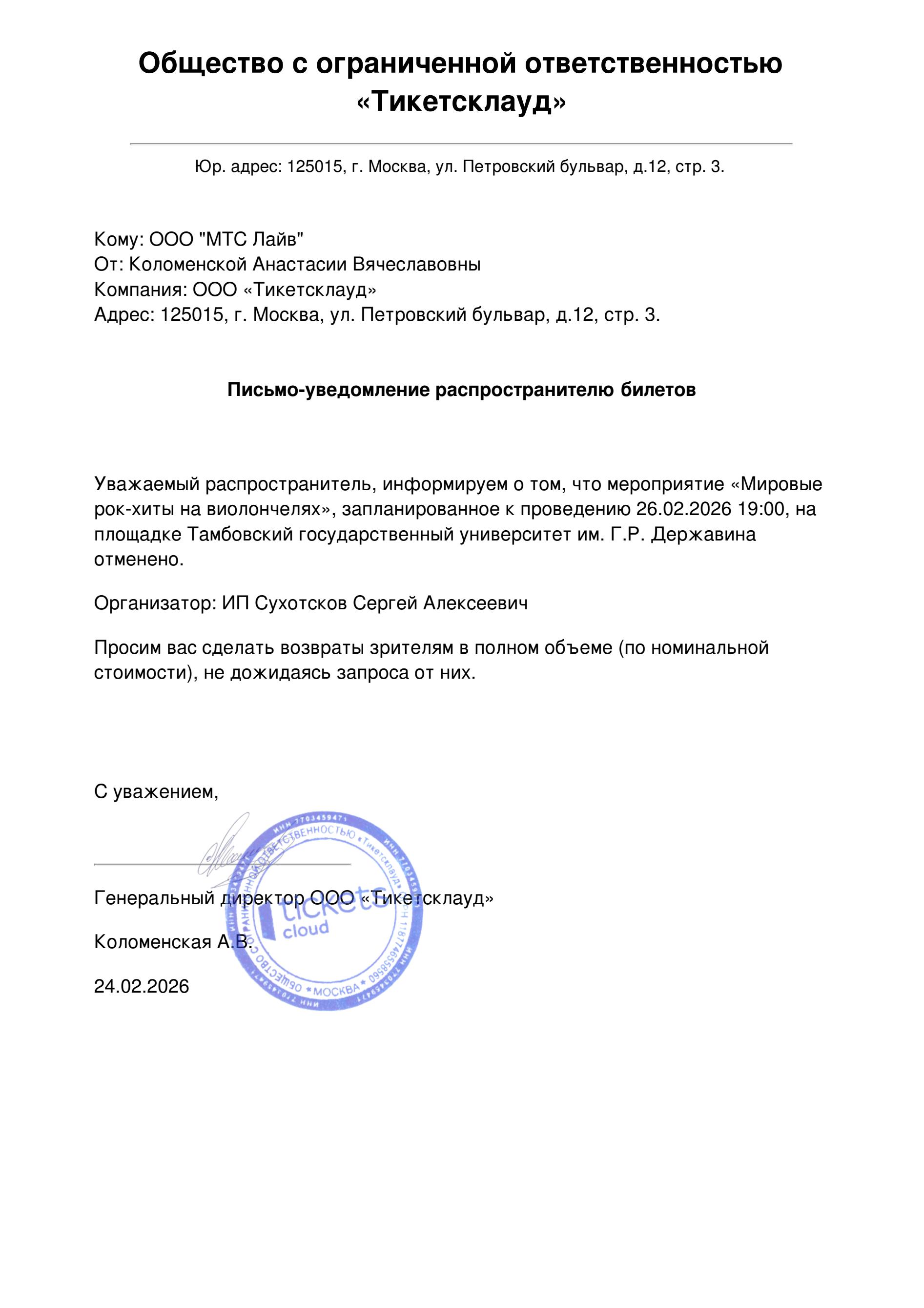 Уважаемый клиент! Спешим сообщить, что по информации, полученной от организатора, концерт «Мировые рок-хиты на виолончелях», запланированный на 26 февраля 2026 года в 19:00 в Учебном театре Державинского университета, отменён. Деньги за электронные билеты вернутся автоматически в полном объёме на карту, с которой была произведена оплата. Если вы купили билет в кассе Ticketland.ru за наличный расчет, то обратитесь, пожалуйста, на почту: vozvrat@ticketland.ru. С уважением, команда поддержки Ticketland.