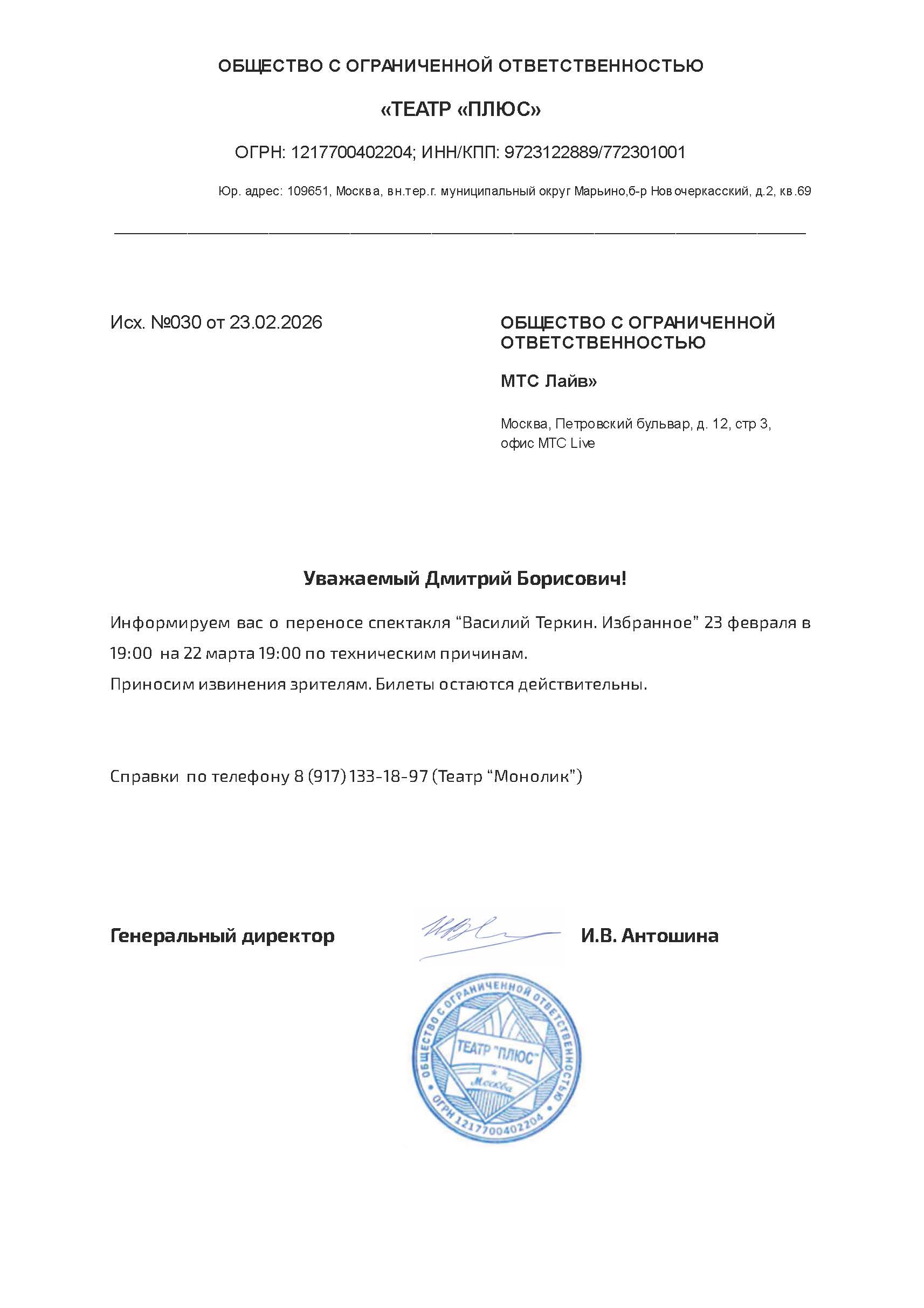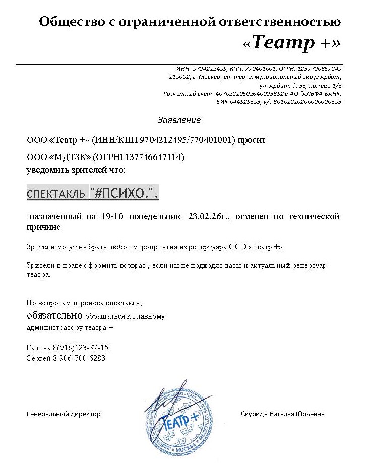 Уважаемый клиент! Актуальная информация. Спешим сообщить, что по информации, полученной от организатора, спектакль «#ПСИХО», запланированный на 23 февраля 2026 года в 19:10 в Центральном Доме Актёра, отменён. Организатор предлагает выбрать любое мероприятия из репертуара ООО «Театр +». По вопросам переноса спектакля обращайтесь, пожалуйста, к главному администратору театра по номеру телефона: 8 (916) 123-37-15 (Галина) и 8 (906) 700-62-83 (Сергей). Если вам не удобно посетить любое мероприятие организатора в новую дату, вы можете вернуть билет по кнопке в личном кабинете во вкладке «Заказы» (до 28 февраля 2026 года включительно). Деньги за электронные билеты вернутся автоматически в полном объёме на карту, с которой была произведена оплата. Если вы купили билет в кассе Ticketland.ru за наличный расчет, то обратитесь, пожалуйста, на почту: vozvrat@ticketland.ru. С уважением, команда поддержки Ticketland.