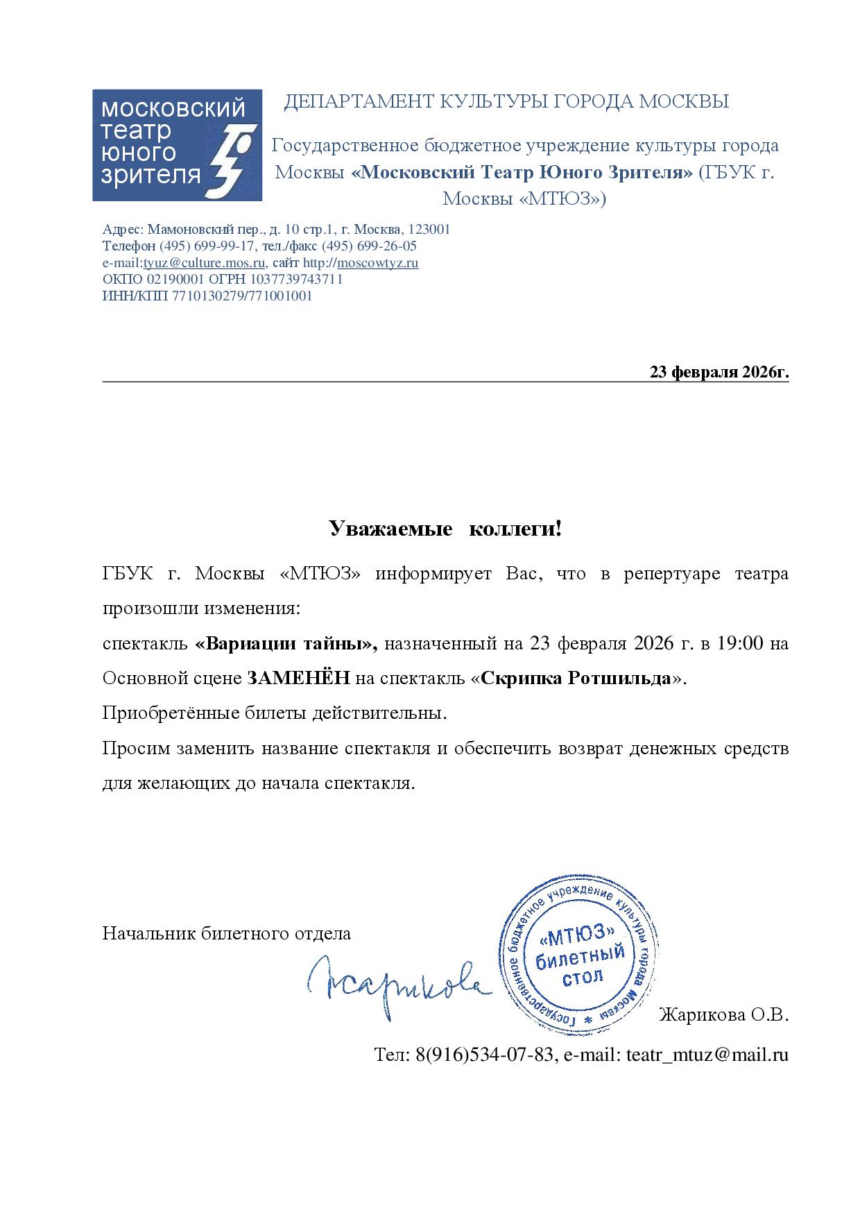 Уважаемый клиент! Спешим сообщить, что по информации, полученной от организатора, спектакль «Вариации Тайны», запланированный на 23 февраля 2026 года в 19:00 в МТЮЗе, заменен на спектакль «Скрипка Ротшильда». Ранее приобретенные билеты действительны, обменивать их не нужно. Если вы не хотите посетить мероприятие, вы можете вернуть билет по кнопке в личном кабинете во вкладке «Заказы» (до 23.02.2026 19:00). Деньги за электронные билеты вернутся автоматически в полном объёме на карту, с которой была произведена оплата. Если вы купили билет в кассе Ticketland.ru за наличный расчет, то обратитесь, пожалуйста, на почту: vozvrat@ticketland.ru. С уважением, команда поддержки Ticketland.
