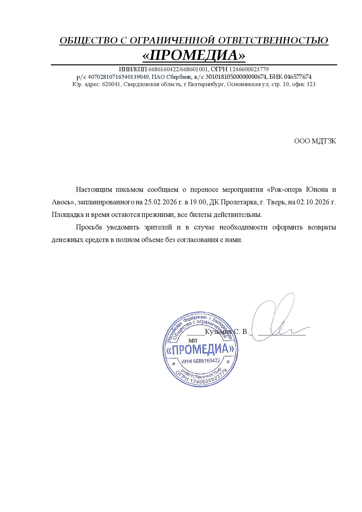 Уважаемый клиент! Спешим сообщить, что по информации, полученной от организатора, рок-опера «Юнона и Авось», запланированная на 25 февраля 2026 года в 19:00 в ДК «Пролетарка», перенесён на 2 октября 2026 года, начало в 19:00. Ранее приобретенные билеты действительны на новую дату, обменивать их не нужно. Если вам не удобно посетить мероприятие в новую дату, вы можете вернуть билет по кнопке в личном кабинете во вкладке «Заказы». Деньги за электронные билеты вернутся автоматически в полном объёме на карту, с которой была произведена оплата. Если вы купили билет в кассе Ticketland.ru за наличный расчет, то обратитесь, пожалуйста, на почту: vozvrat@ticketland.ru. С уважением, команда поддержки Ticketland.