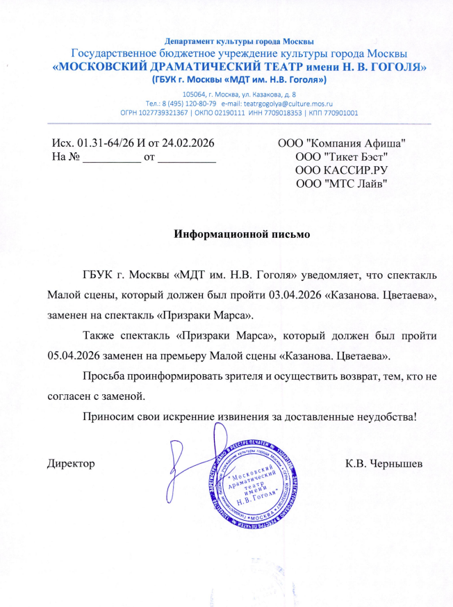 Уважаемый клиент! Спешим сообщить, что по информации, полученной от организатора, спектакль «Призраки Марса», запланированный на 5 апреля 2026 года в Театре Гоголя, заменён на спектакль «Казанова. Цветаева». Ранее приобретенные билеты действительны на новый спектакль, обменивать их не нужно. Если вы не хотите посетить новое мероприятие, вернуть билет можно по кнопке в личном кабинете во вкладке «Заказы». Деньги за электронные билеты вернутся автоматически в полном объёме на карту, с которой была произведена оплата. Если вы купили билет в кассе Ticketland.ru за наличный расчет, то обратитесь, пожалуйста, на почту:vozvrat@ticketland.ru. С уважением, команда поддержки Ticketland.