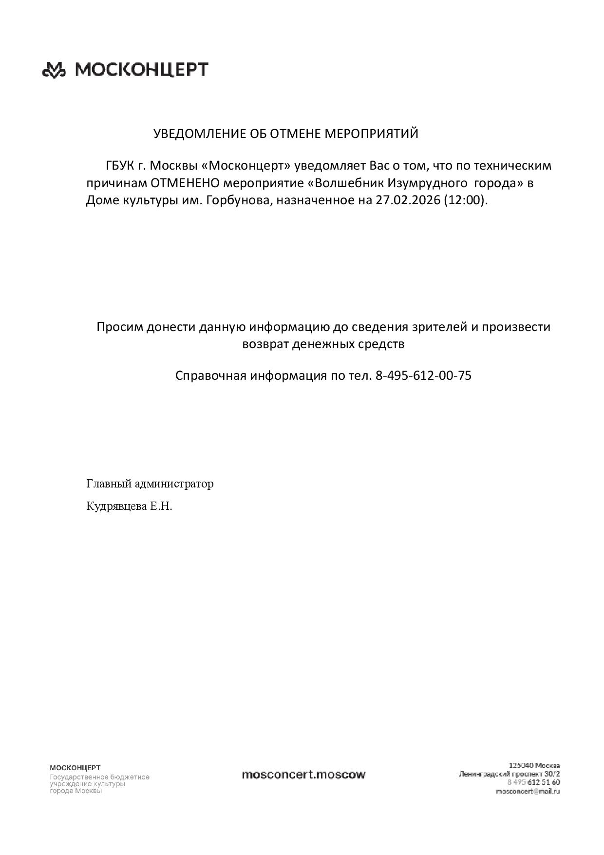 Уважаемый клиент! Спешим сообщить, что по информации, полученной от организатора, спектакль «Волшебник Изумрудного города», запланированный на 27 февраля 2026 года в 12:00 в ДК имени Горбунова, отменён. Деньги за электронные билеты вернутся автоматически в полном объёме на карту, с которой была произведена оплата. Если вы купили билет в кассе Ticketland.ru за наличный расчет, то обратитесь, пожалуйста, на почту: vozvrat@ticketland.ru. С уважением, команда поддержки Ticketland.