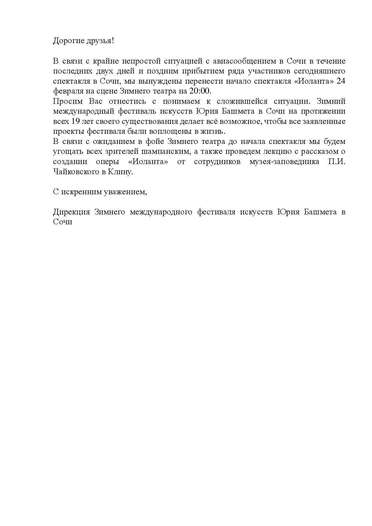 Уважаемый клиент! Спешим сообщить, что по информации, полученной от организатора, XIX Зимний международный фестиваль искусств. Опера «Иоланта», запланированный на 24 февраля 2026 года в 19:00 в Зимнем театре Сочи, начнётся на час позже. Верное время начала мероприятия - 20:00. Ранее приобретенные билеты действительны на новое время, обменивать их не нужно. С уважением, команда поддержки Ticketland.