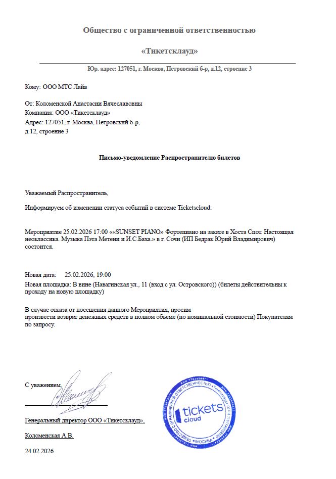 Уважаемый клиент! Спешим сообщить, что по информации, полученной от организатора, концерт «Sunset Piano. Фортепиано на закате. Настоящая неоклассика. Музыка Пэта Метени и И.С. Баха», запланированный на 25 февраля 2026 года в 17:00 в Джаз клубе «Хоста Спот», перенесен на другую площадку с изменением времени начала. Новая площадка: В вине (Навагинская ул., 11 (вход с ул. Островского)). Концерт начнётся в 19:00. Ранее приобретенные билеты действительны, обменивать их не нужно. Если вы не хотите посетить мероприятие, вы можете вернуть билет по кнопке в личном кабинете во вкладке «Заказы» (до 25.02.26 19:00). Деньги за электронные билеты вернутся автоматически в полном объёме на карту, с которой была произведена оплата. Если вы купили билет в кассе Ticketland.ru за наличный расчет, то обратитесь, пожалуйста, на почту: vozvrat@ticketland.ru. С уважением, команда поддержки Ticketland.